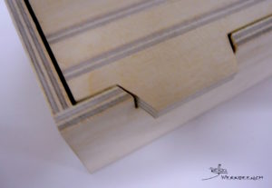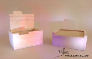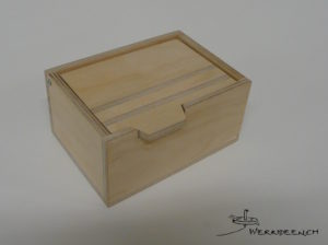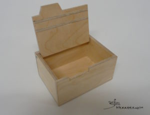 Entwickle eine Schachtel mit einem Klappdeckel. Überlege zuerst, welchen Zweck deine Schachtel haben soll und plane nun entsprechend die Grösse. Säge die Holzteile zu. Beachte die Scharnierlösung auf dem Detailbild und plane diese Lösung auch bei dir ein. Suche eine einfache Lösung, damit sich dein Deckel einfach öffnen lässt. Auf den Bildern ist eine machbare, aber nicht ganz einfach zu konstruierende Lösung ersichtlich.