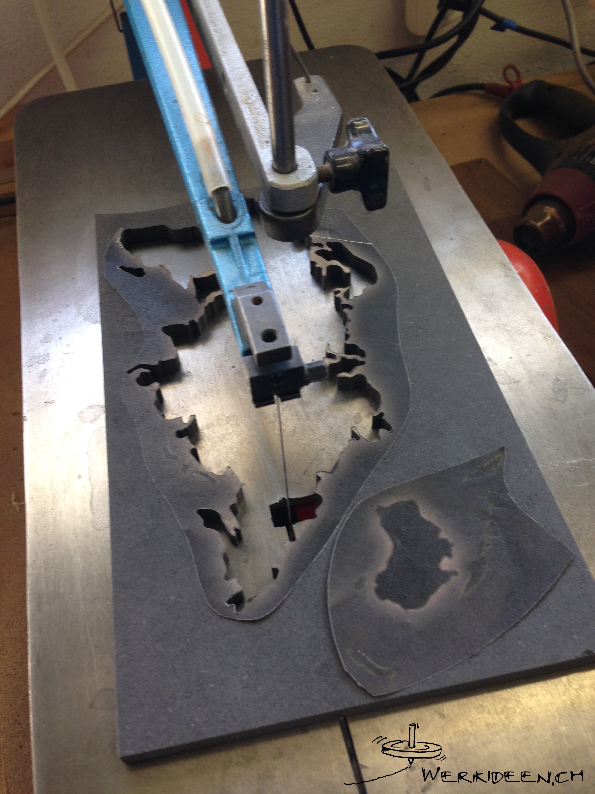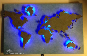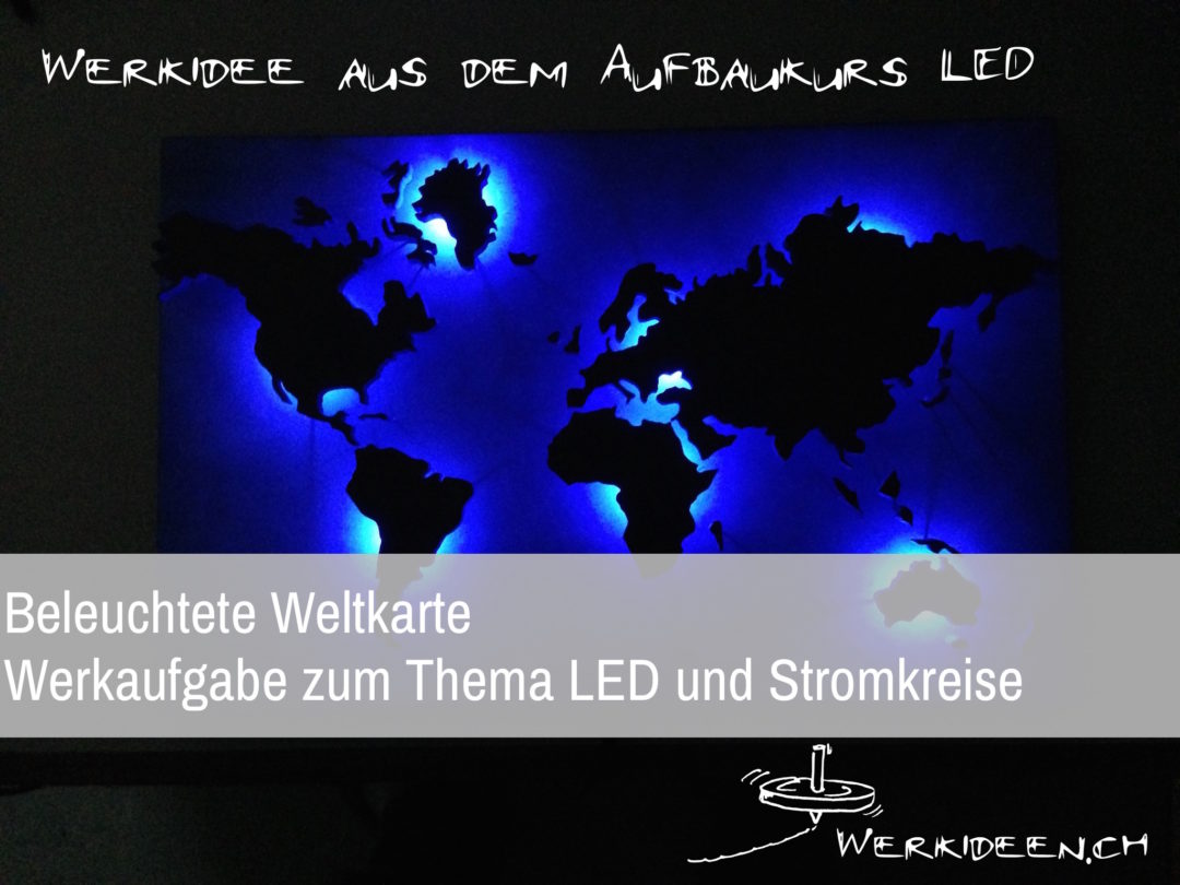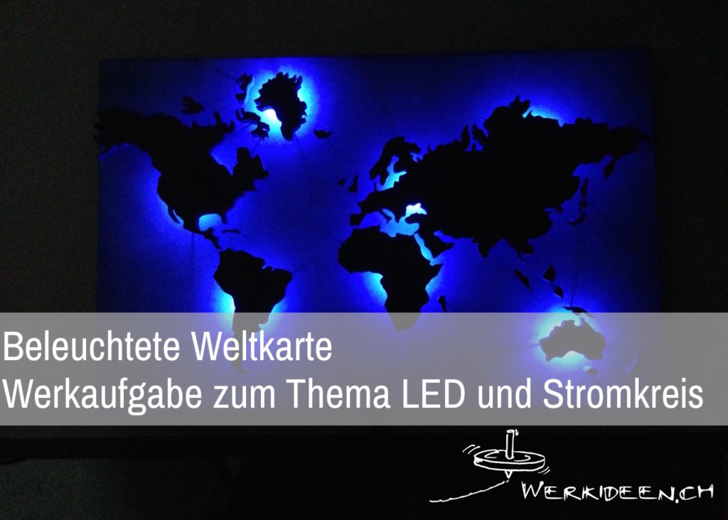 Wähle eine geografische Karte deiner Wahl aus. Übertrage die Konturen auf die Holzplatte, indem du sie durchpaust oder aufklebst. Säge die Konturen nun exakt aus. Platziere die LEDs auf der Grundplatte und stelle die Stromkreise mit Serie- bzw. Parallelschaltung her. Baue auch den Schalter ein, erstelle auf der Rückseite der Grundplatte ein Batteriegehäuse sowie eine Aufhängevorrichtung. Montiere nun die ausgesägten Teile auf der Vorderseite der Grundplatte mittels Distanzhalter aus Holz oder dünnen Schweissstäben.