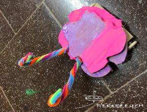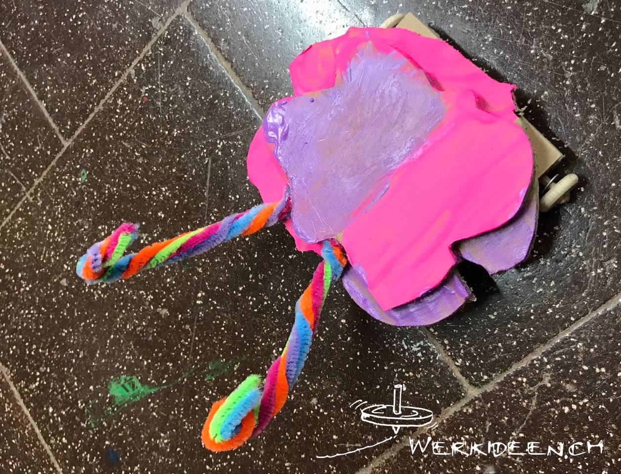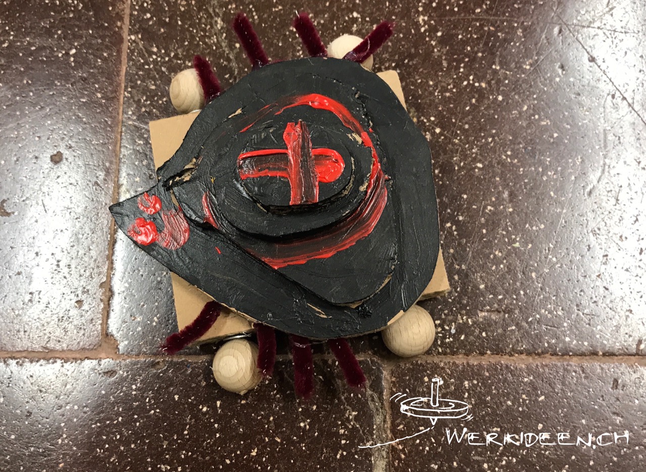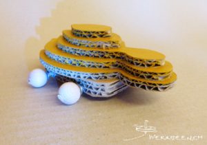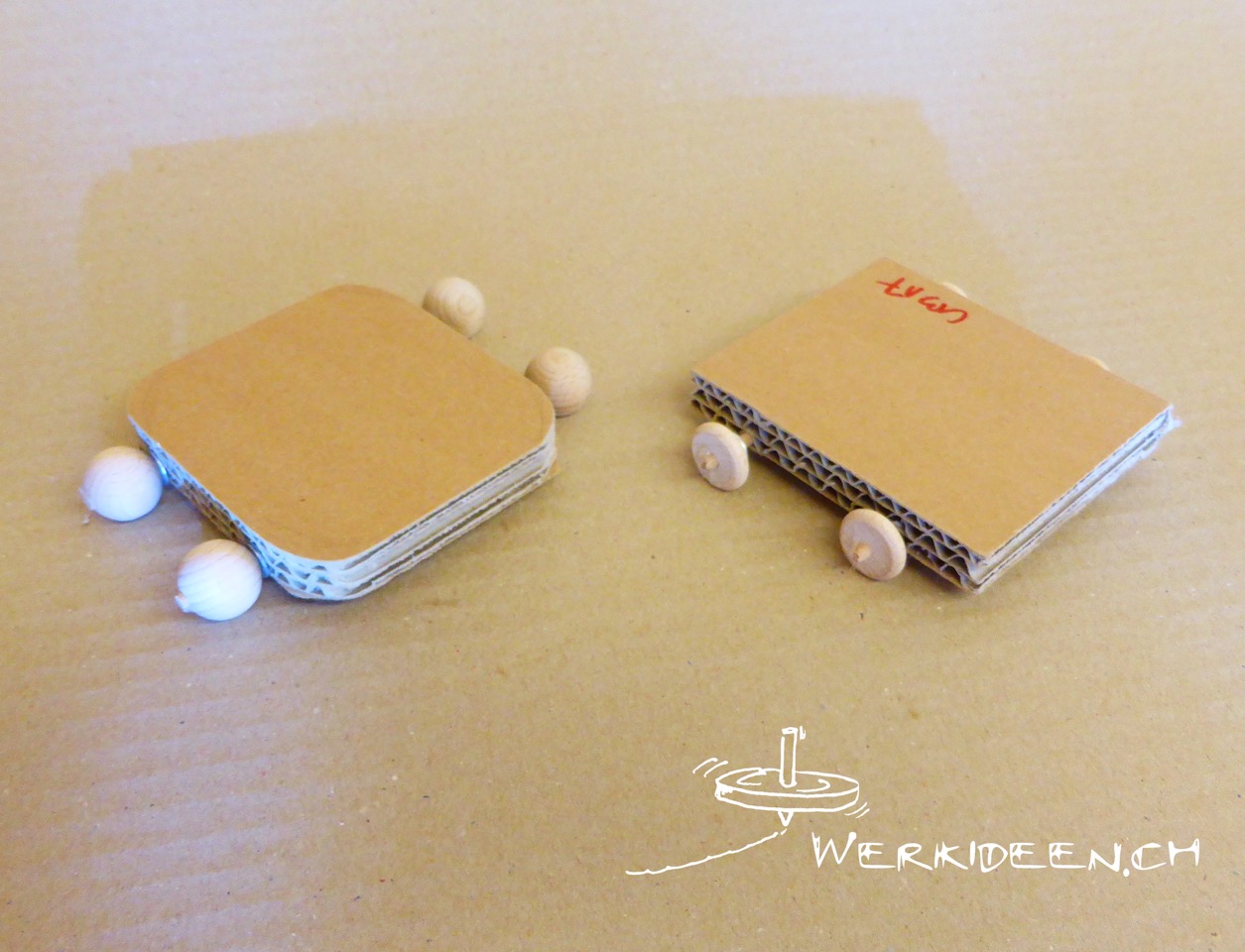 Entwickle ein fahrbares Brett aus einem Stück Wellkarton. Stecke die Achse durch die Wellen und achte darauf, dass diese gut dreht. Montiere die Kugeln oder die Räder an den Achsen. Säge nun aus Wellkartonstücken verschiedene Schichten zu, so dass du ein dreidimensionales Tier gestalten kannst. Färbe dein Tier an und montiere Zusatzteile wie Fühler, Stachel, Augen usw.