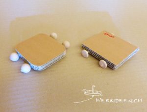 Wellkarton mit Doppelwelle, Rundstäbe 4 mm, Holzkugeln oder Holzräder, Unterlagscheiben, Röhrchen, div. Klainmaterial aus dem Werkstofflager.