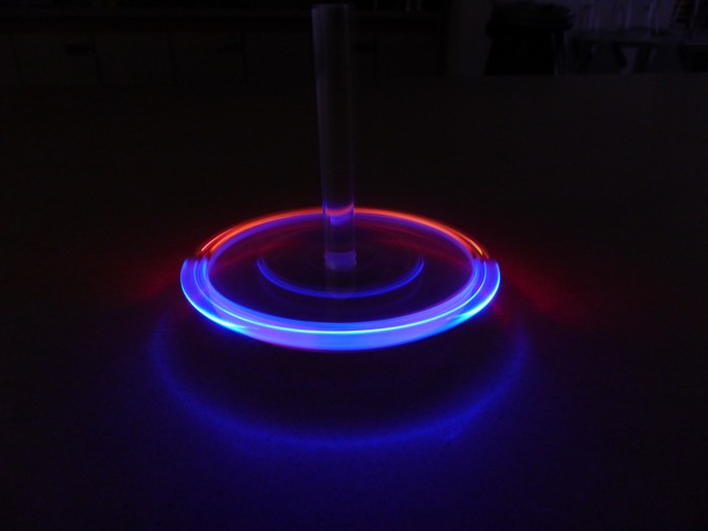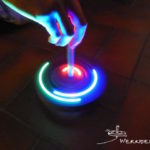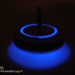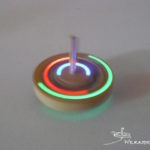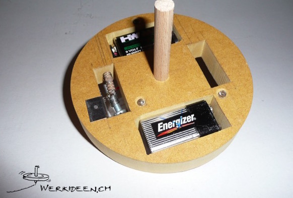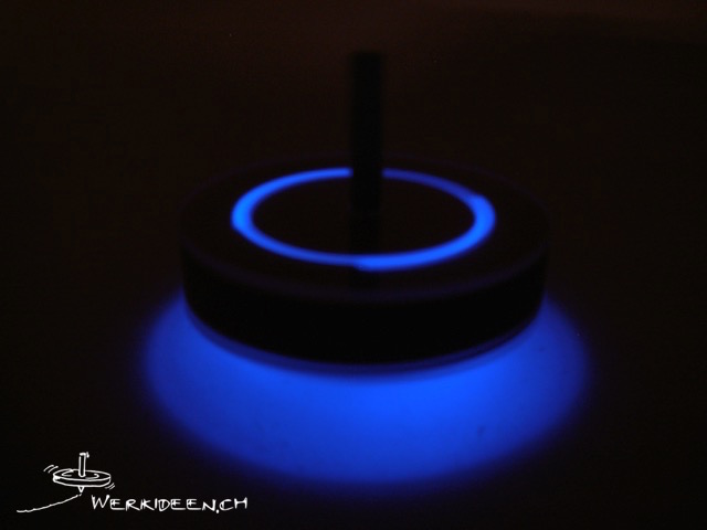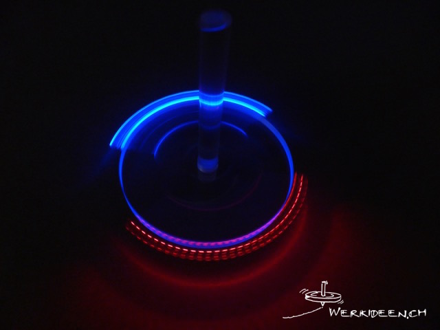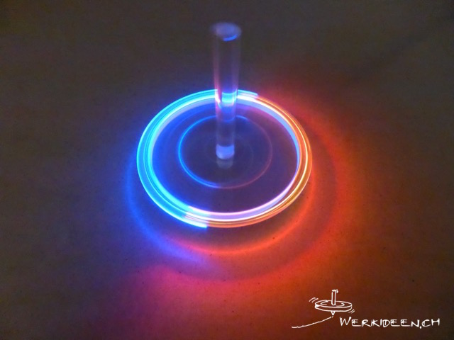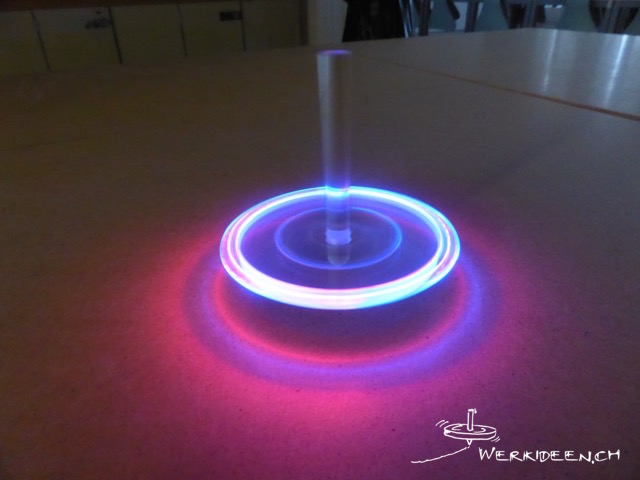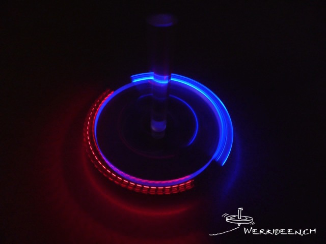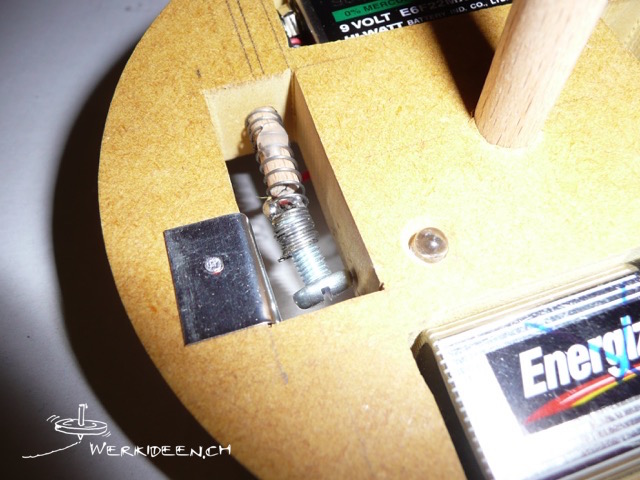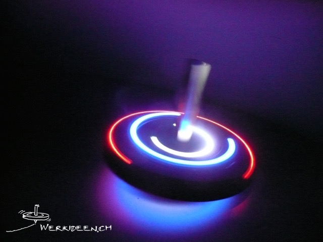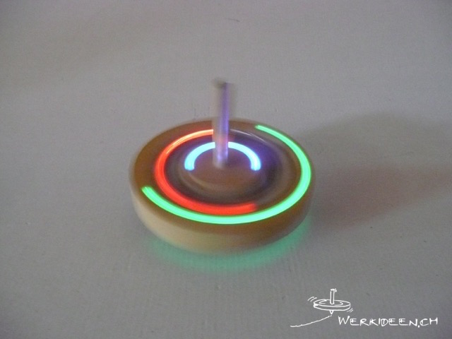 Entwickle einen Schleuderschalter, so dass dein Kreisel nur bei Drehbewegung beleuchtet wird. Dazu verwendest du am besten eine Stahlfeder, die beim Schleudern durch die Fliehkraft nach aussen gedrückt wird und den Stromkreis schliesst.