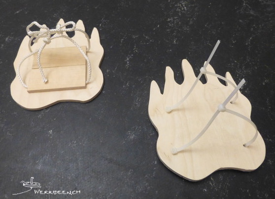 Sperrholz Birke (ist in der Regel wasserfest verleimt), Lüsterklemmen, Klettband, dicke Schnur, Elektrikerdraht oder andere Materialien aus dem Werkstofflager