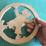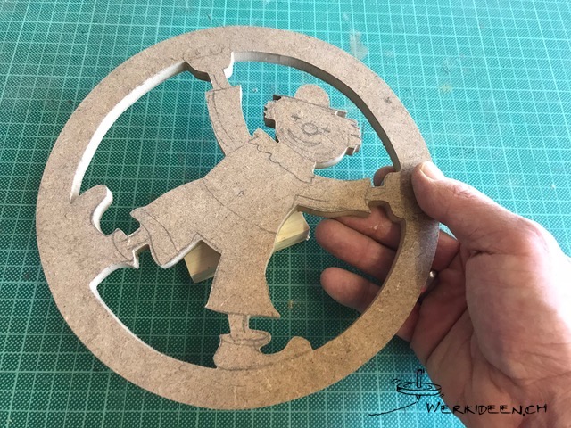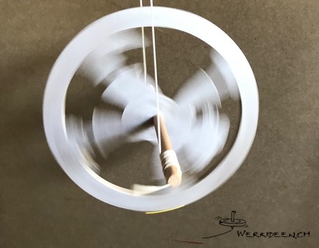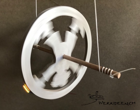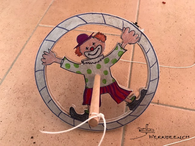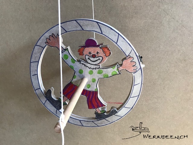 Zeichne ein Röhnrad mit einer Figur auf eine Holzplatte. Säge die Aussenform aus. Bohre Löcher und säge nun auch die Innenform aus. Zentriere deine Figur auf einem flachen Nagelkopf. Bohre im Zentrum ein Loch mit dem Durchmesser 10 mm . Bemale deine Figur. Schiebe dann einen Holzrundstab durch das Loch. Bohre an dessen beiden Enden ein kleines Loch, fädle eine Schnur ein und hänge dein Röhnrad auf. Drehe die Schnur nun auf und lasse deine Figur drehen.