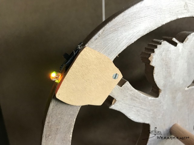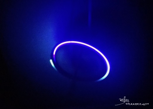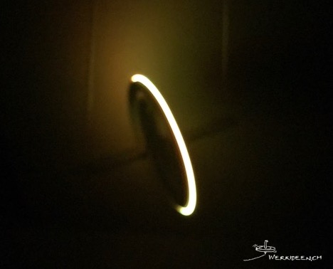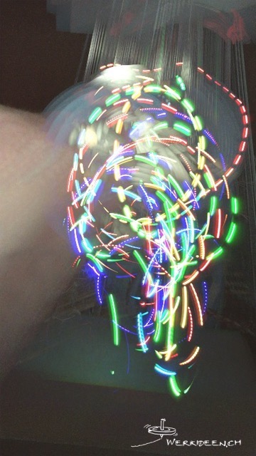 Baue eine Leuchtdiode, eine Knopfbatterie und einen kleinen Schalter im Röhnrad ein. Nun entsteht beim Drehen ein im Dunkeln eine schöne Leuchtspur.