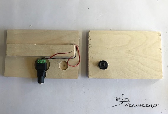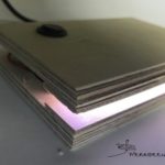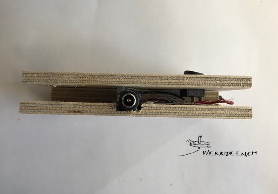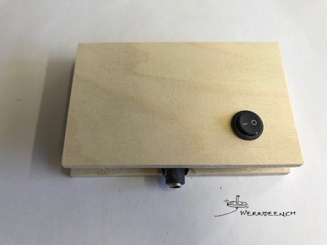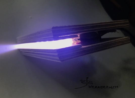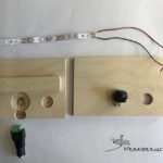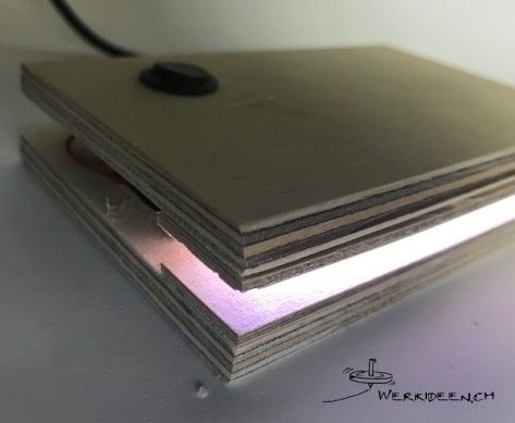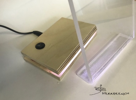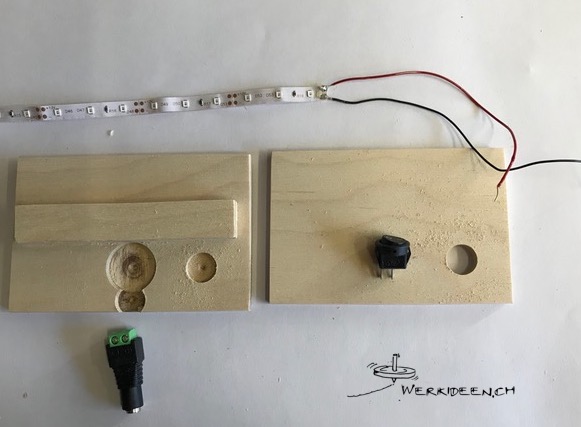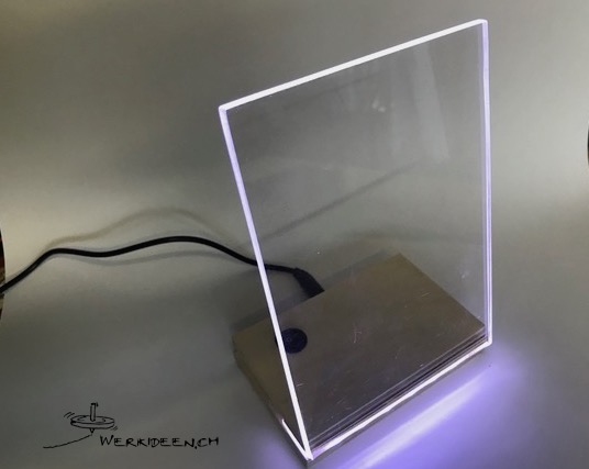Holzwerkstoff-Platte, z. B. Birkensperrholz, Acrylglasplatte Dicke 5 – 6 mm, Ladegerät, entsprechender LED-Streifen (z.B. von Aliexpress), evtl. 9V-Batterie mit Batterieclip, Widerstand, Schalter, Elektrikerdraht.