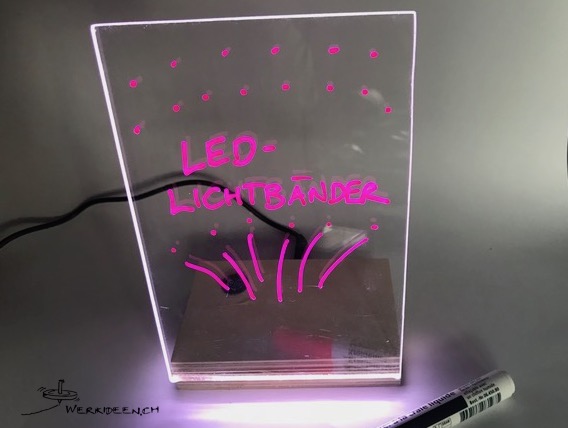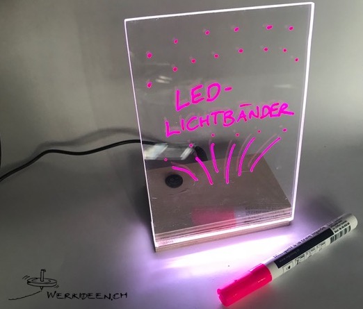 Entwickle aus Acrylglas und Sperrholz eine beleuchtete to-do-Liste. Auf die Acrylglasplatte kannst du mit einem Kreidemarker schreiben und oder zeichnen, und durch die Beleuchtung fällt deine Schrift besonders auf. Entwickle den Sockel aus Sperrholz und baue den Leuchtstreifen, den Schalter und die Anschlussbuchse ein. Säge eine passende Acrylglas-Platte zurecht und schleife sie. Achte beim Montieren darauf, dass du die Platte zum Putzen einfach herausnehmen kannst, indem du sie passend festklemmst.