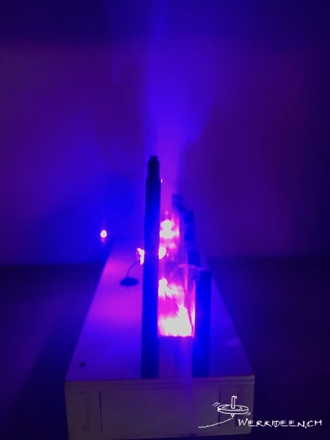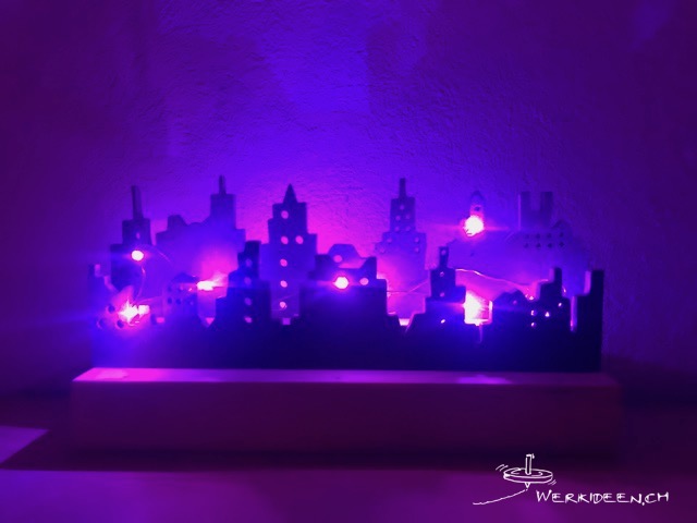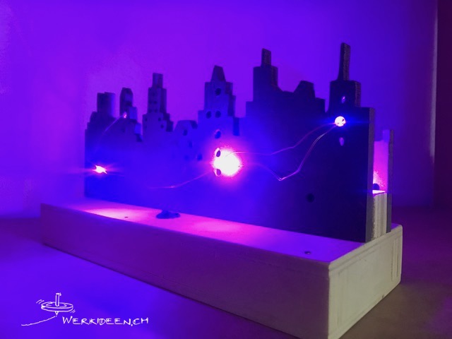 Entwickle ein Lichterketten-Lämpchen. Dazu verwendest du eine Lichterkette mit Mini-LEDs oder ein Stück von einer USB-Lichterkette, das du an eine 4.5 V-Batterie anschliessen kannst. Unten baust du einen Batteriekasten mit einem Schalter. Für die Silhouette verwendest du eine Holzwerkstoffplatte. Besonders eignet sich schwarzes MDF, weil die Kanten nach dem Sägen bereits gefärbt sind. Du kannst aber auch eine Holzwerkstoffplatte mit Acyrlfarbe färben. Baue nachher den Stromkreis ein und montiere deine Silhouette mit den Mini-LEDS.