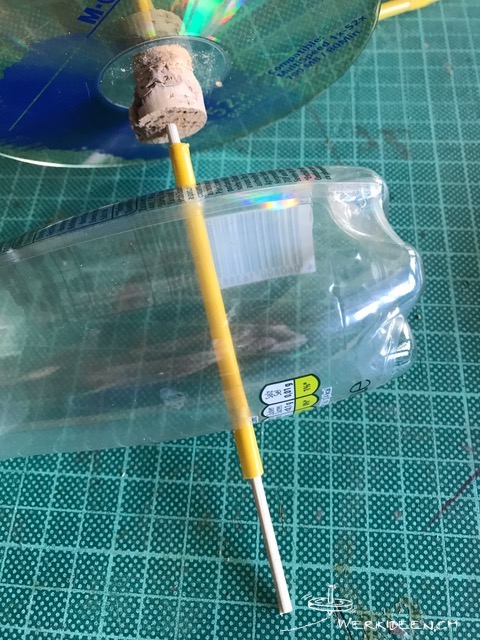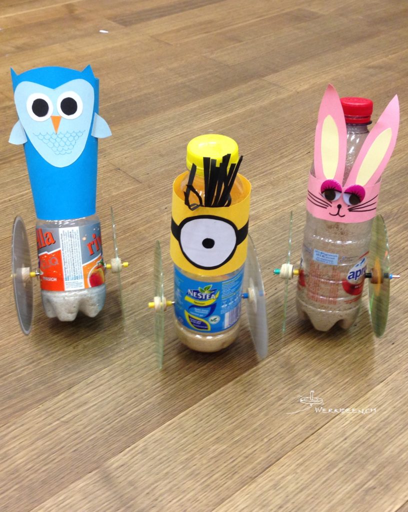 Entwickle einen Pendler. Dazu musst du einen Korkzapfen auf zwei Seiten so zuschneiden, dass die beiden Enden genau in das Loch in der CD passen und dort klemmen. Evtl. kannst du mit einer Nagelfeile nach dem Schneiden den Korkzapfen genau einpassen. Halbiere den Korkzapfen und stich mit einem spitzen Gegenstand je ein Loch im Zentrum ein. Mache in eine 5 dl-PET-Flasche mit einem spitzen Objekt ca. 5 cm ab Boden zwei Löcher. Stecke ein Trinkröhrchen durch und montiere deine CD-Räder. Fülle Sand ein, bis der Pendler stabil steht und teste ihn, indem du ihn von einer Rampe herunter rollen lässt. Wenn du magst, kannst du deine PET-Flasche auch noch in eine lustige Figur verwandeln.
