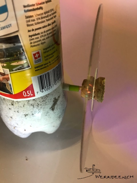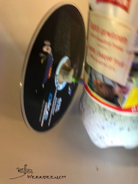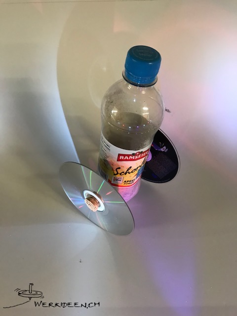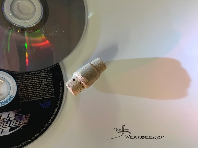 Stelle einen Kreisel aus einer CD her. Schneide vorsichtig einen Korkzapfen zu, so dass er genau in das Loch in der CD passt und dort klemmt. Evtl. kannst du mit einer Nagelfeile nach dem Schneiden den Korkzapfen genau einpassen. Stich mit einem spitzen Gegenstand (Stricknadel, Spiesschen) ein Loch exakt in die Mitte des Zapfens und stecke ein gekürztes Holzspiesschen ein. Falls das Holzspiesschen unten nicht heraus schaut, montierst du einen Reissnagel. Lass den Kreisel drehen.