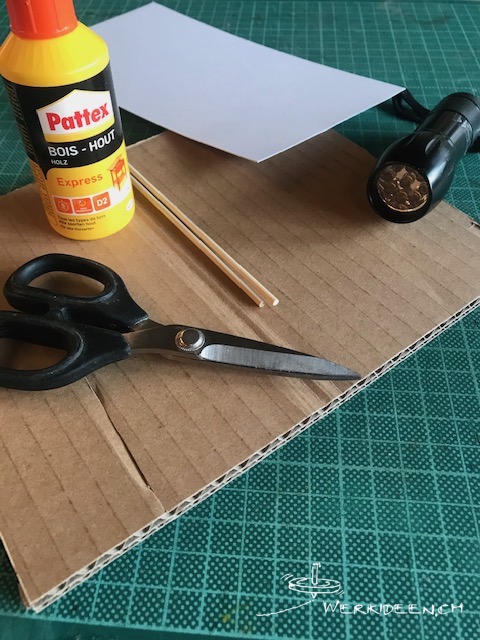 Für die Werkidee@home 03 brauchst du eine Taschenlampe, dickes Papier oder Halbkarton, Wellkarton und evtl. Spiesschen. Trage das Material bereits jetzt zusammen.