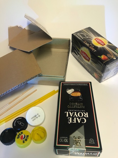 PS  Für die Werkidee@home 04 “Osterchallenge“ brauchst du vier PET-Flaschendeckel, eine kleine Schachtel, Karton, evtl. Wellkarton, Röhrchen, Holzspiesschen und ein Osterei.        Trage das Material bereits jetzt zusammen.