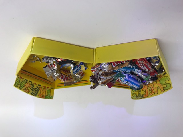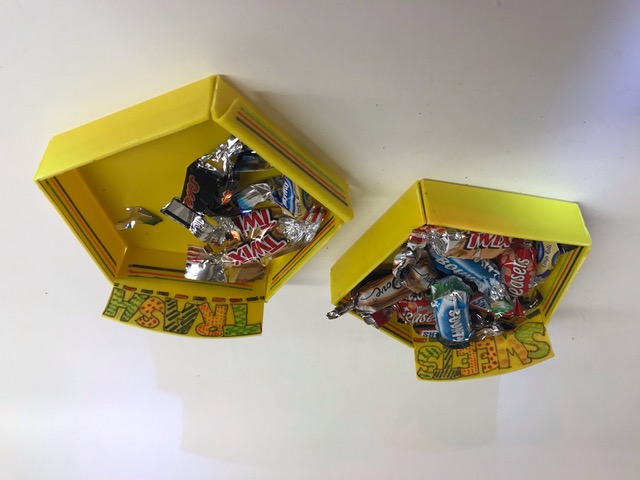 Entwickle zwei kleine Schalen, die aneinander gehängt werden können. In eine Schale kommen nun zum Beispiel die Nüsse, in die andere Nussschalen. Verwende dazu Polystyrol, das du auf einem Biegegerät umformen kannst. Konstruiere zuerst aus Halbkarton eine Vorlage und wähle dazu eine geometrische Form, ein Viereck, Fünfeck, Sechseck… . Schneide die Vorlage aus, teste sie und übertrage sie dann auf die Polystyrolplatte. Säge die beiden Teile aus, schleife die Kanten und biege sie auf dem Linearbiegegerät. Gestalte die beiden Schalen mit wasserfesten Filzstiften.