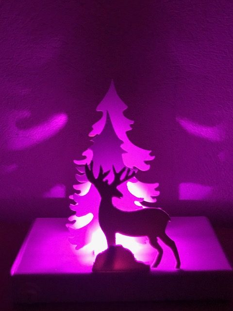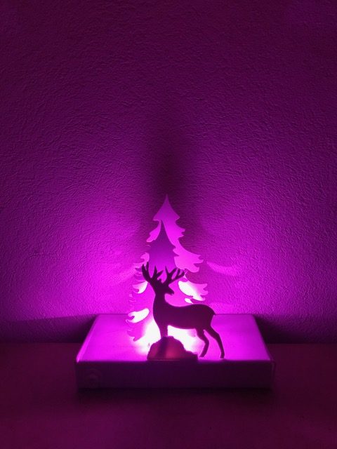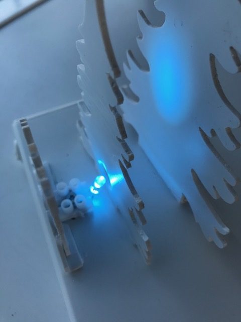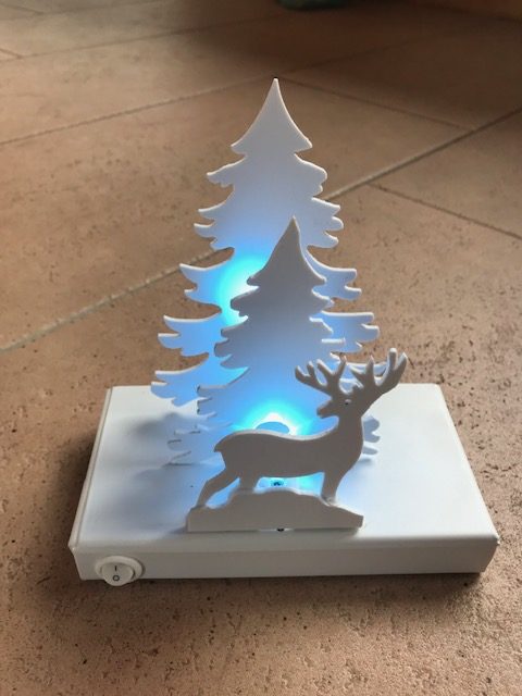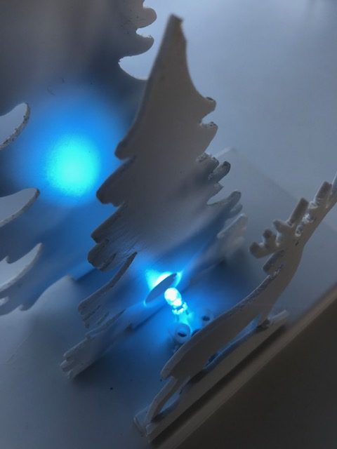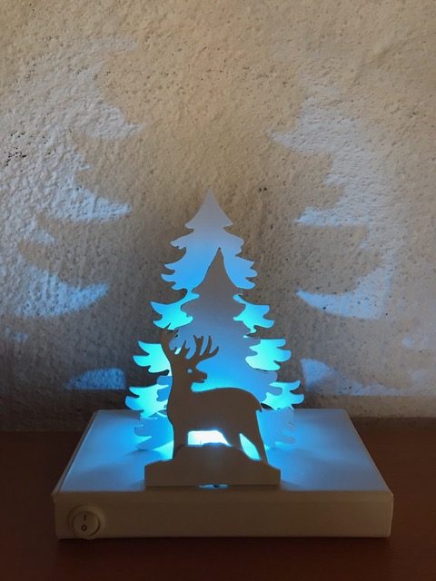 Entwickle ein Winterlämpchen aus weissem Polystyrol. Plane zuerst deine Grundfläche, erstelle aus Halbkarton ein Modell für das Kästchen und säge die Grundform entsprechend aus. Bohre das Loch für den Schalter und biege dein Kästchen mit dem Linearbiegegerät. Erstelle nun die drei Schichten für dein Sujet. Die vorderste Schicht ist dunkel und soll die LED verstecken. Die mittlere Schicht wird durchbohrt, so dass das Licht der LED auch die hinterste Schicht beleuchtet. Plane bei den Schichten zum Kleben zusätzlich ein Füsschen ein, das umgebogen wird. Erstelle nun den Stromkreis mit LED, Widerstand, Schalter und Batterieanschluss und füge die Schichten mit Polystyrolkleber oder Heissleim.