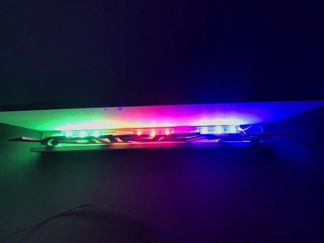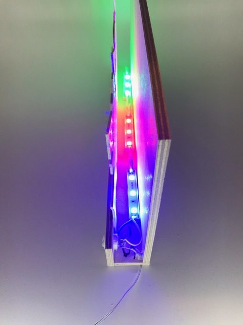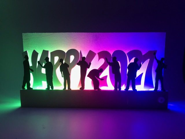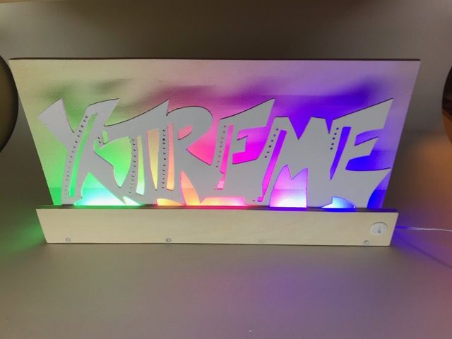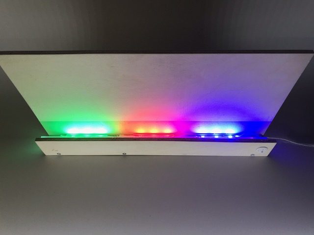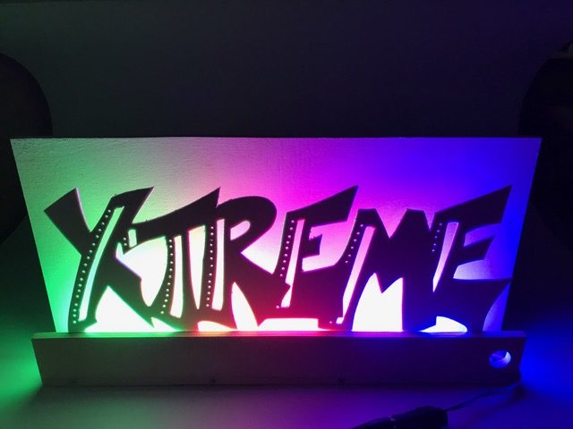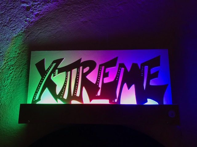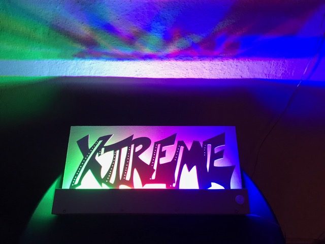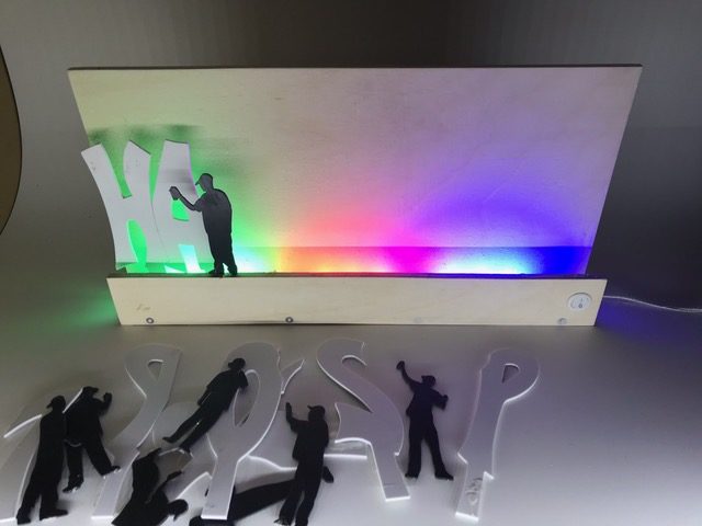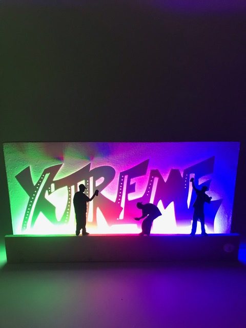 Entwickle eine mit LEDs beleuchtete Graffiti-Wall. Erstelle zuerst die Wand mit Sockel und Abdeckung, so dass die Lichtquelle nicht zu sehen ist. Für die Beleuchtung kannst du LEDs, Leuchtbänder oder LED-Chips verwenden. Beim Beispiel oben sind 3 LED-Bauteile mit unterschiedlichen Farben aneinander gehängt. Erstelle den Stromkreis und teste deine Wand. Säge nun aus einer dünnen Werkstoffplatte (z.B. MDF, Polystyrol, Sperrholz) ein Graffiti aus. Schliefe deine Teile und montiere sie an der vorderen Abdeckung. Teste deine Graffiti-Wall in der Dunkelkammer.