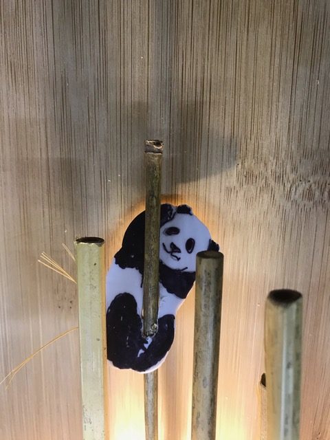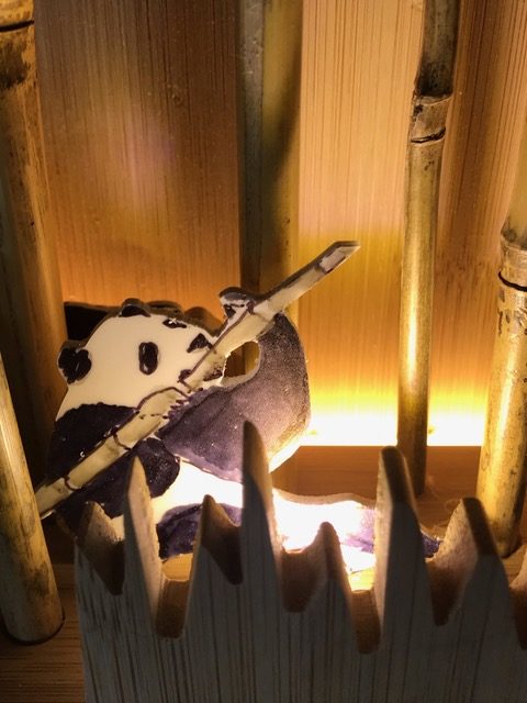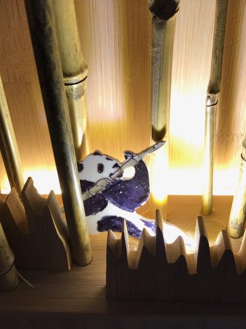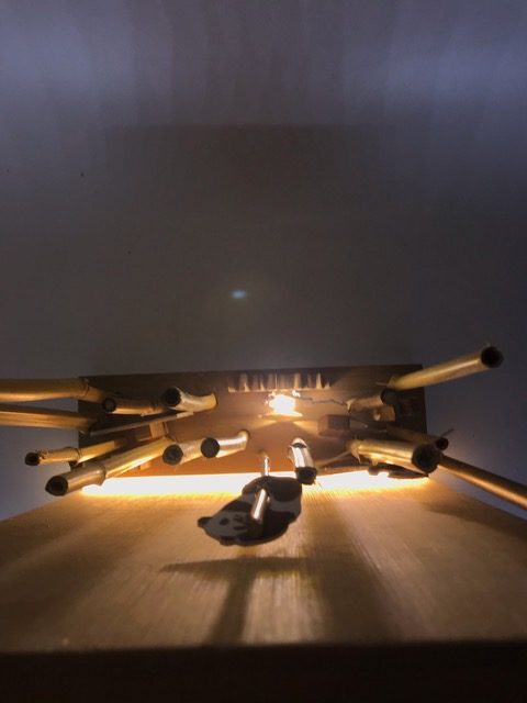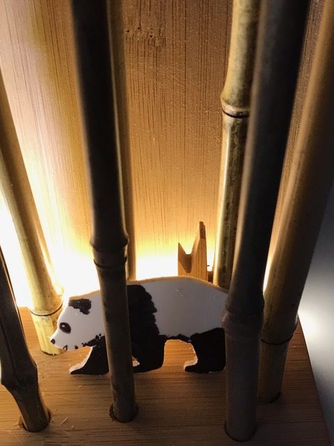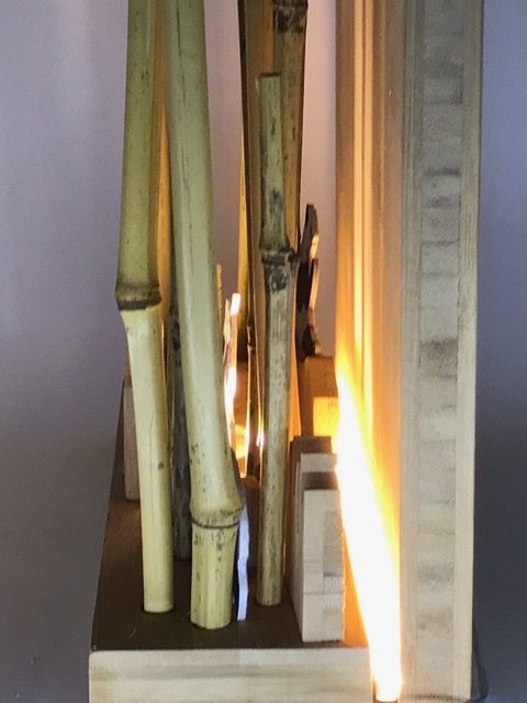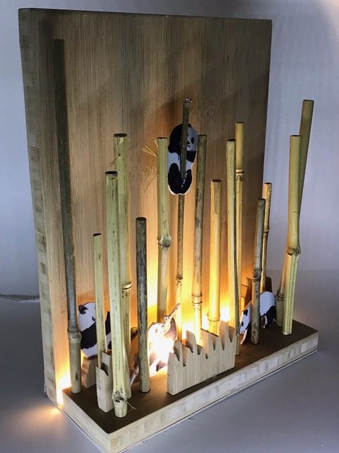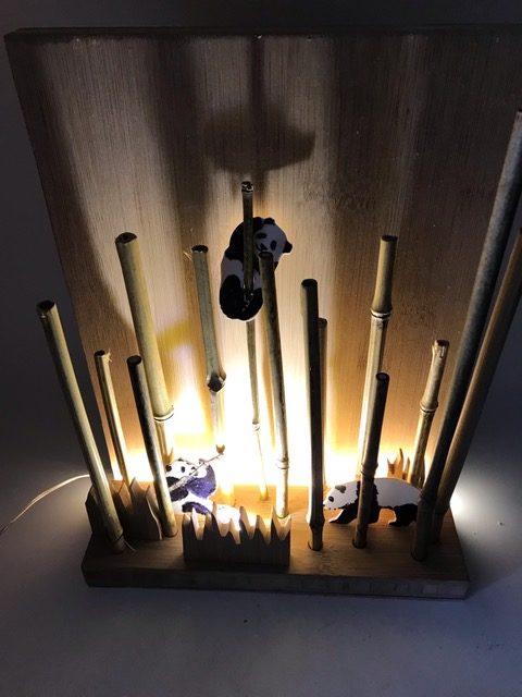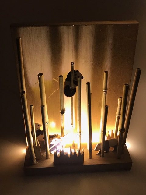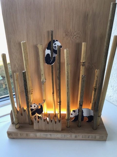 Entwickle einen mit LEDs beleuchteten Bambuswald. Erstelle zuerst die Wand mit Bodenplatte und Abdeckung, so dass die Lichtquelle nicht zu sehen ist. Für die Beleuchtung kannst du LEDs, Leuchtbänder oder LED-Chips verwenden. Beim Beispiel oben wurden ein Leuchtband unten an der hinteren Wand sowie ein LED-Chip im Vordergrund verwendet. Erstelle den Stromkreis und teste deine Wand. Ergänze dein Bild mit Bambusstangen oder Ästen. Säge nun aus einer dünnen Werkstoffplatte (z.B. MDF, Polystyrol, Sperrholz) Tiere oder Figuren für deinen Wald aus. Schliefe deine Teile und montiere sie an der vorderen Abdeckung. Teste deinen Bambuswald in der Dunkelkammer.