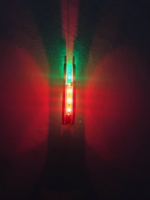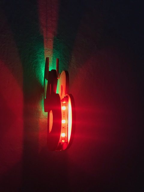Schleife die Teile und färbe oder lackiere sie sie gemäss deinen Vorstellungen. Montiere nun die LED-Bauteile im Zwischenraum, indem du dort eine Halterung für die LED-Bauteile montierst. Erstelle den Stromkreis, baue deine Leuchte zusammen und teste sie in der Dunkelkammer.