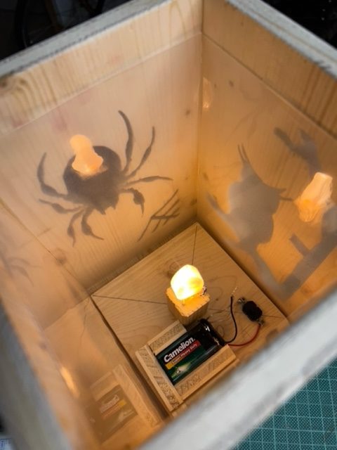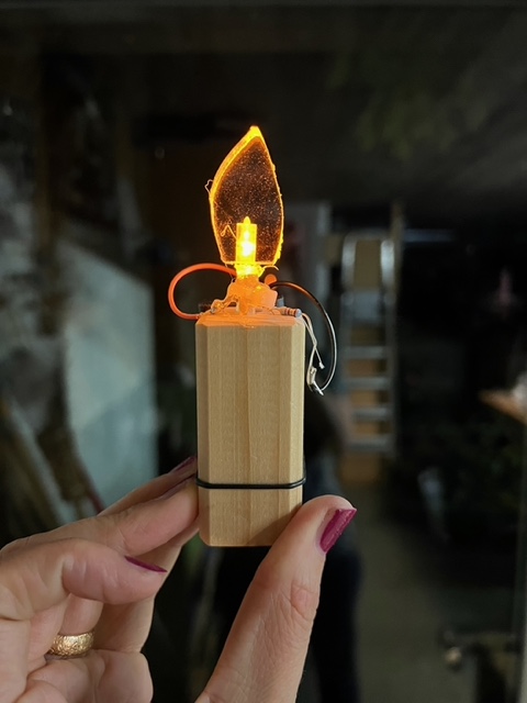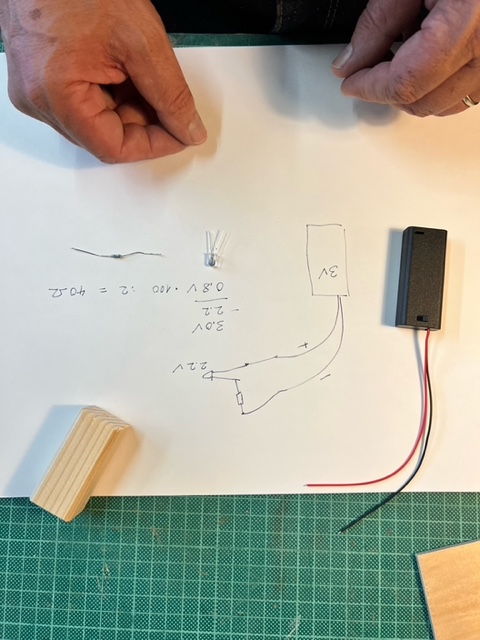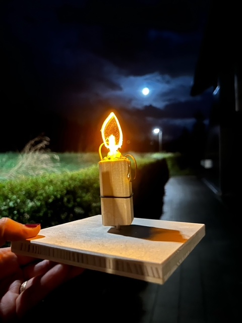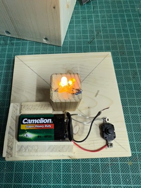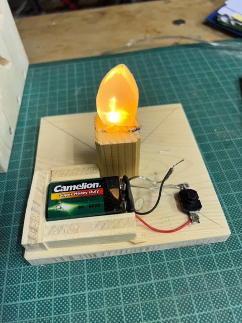 – Batteriekästchen 3 Volt oder 9-Volt-Batterie mit Batterieclip, Schalter, LEDs, evtl. auch flackernde LEDs von Aliexpress (günstig) oder Opitec (Artikel 208590, LED-Candle Light), Widerstand, Acrylglas, Holzleiste