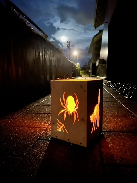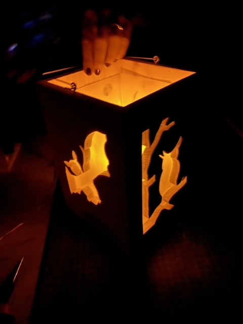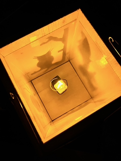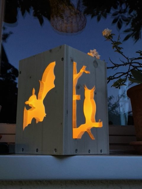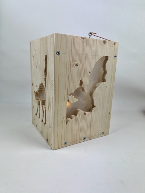 Entwickle eine Laterne mit einer LED-Beleuchtung. Säge den Boden und die 4 Wände zu, skizziere vier Bilder für die Seitenwände und säge sie aus. Verschraube die vier Wände. Säge eine zusätzliche kleine Bodenplatte zu, auf der du dein LED-Lämpchen und den Stromkreis mit Batterie fixieren kannst. Verwende ein 3-Volt-Batteriekästchen mit Schalter oder eine 9-Volt-Batterie mit Batterieclip und einem separaten Schalter. Baue den Stromkreis zusammen und fixiere ihn auf der kleinen Bodenplatte. Klebe auf die Innenseite der Wände Seidenpapier. Ein Tipp: Wenn du das Seidenpapier zuerst laminierst, kannst du die Folie ohne Falten ankleben. Fixiere oben bei der Laterne noch einen Drahtbügel, damit du die Laterne transportieren und aufhängen kannst. Teste am Schluss deine LED-Laterne im Dunkeln.