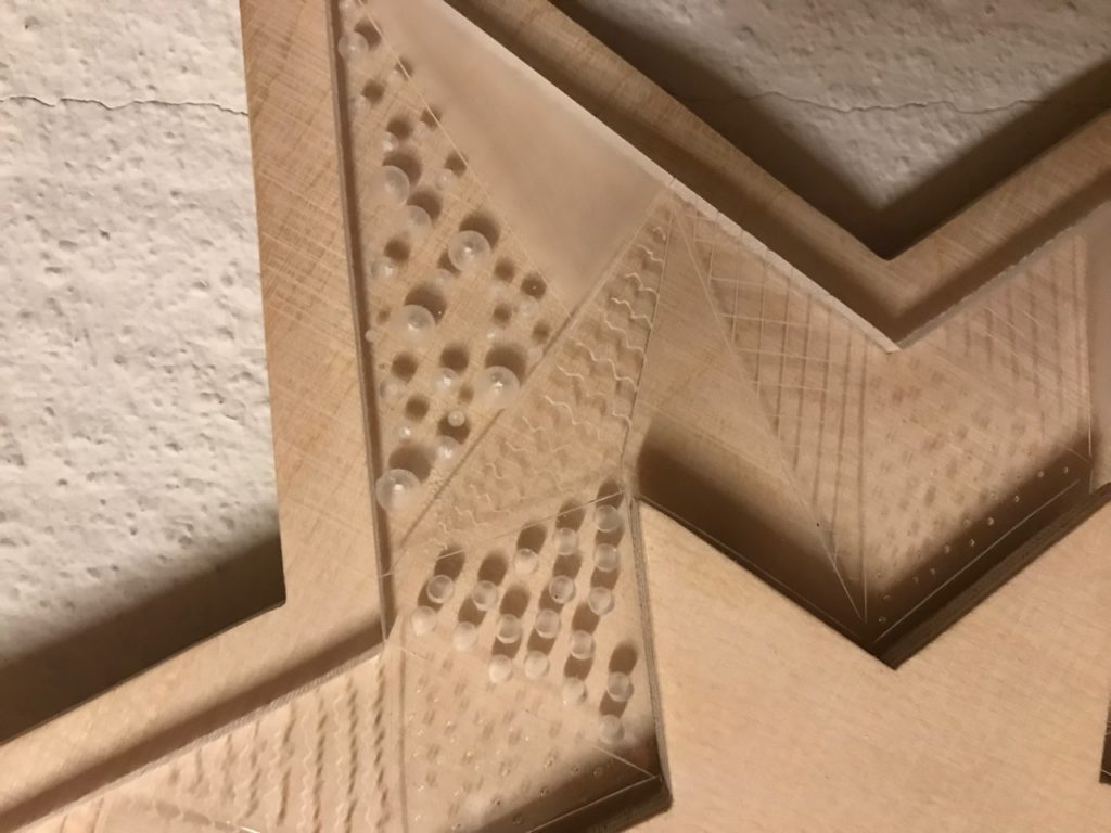 - Das Acrylglas kannst du mit verschiedenen Verfahren gestalten, so dass das Licht des Leuchtbands nicht nur die Kante beleuchtet. Du kannst gravieren mit einem Graviergerät oder auch einfach mit einer Ahle, du kannst die Oberfläche mit Schleifpapier oder einem Stahlnagel bearbeiten oder auch ein Muster einbohren. Teste die Verfahren an einem Reststück und gestalte nun dein Acrylglas.