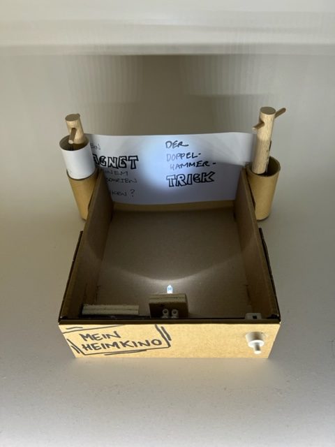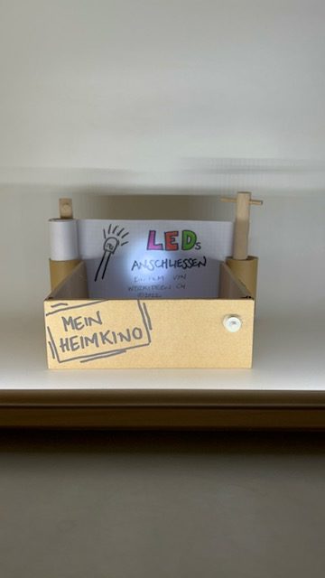 Entwickle ein Heimkino mit einem spannenden „Film“, den du vorführen kannst. Schneide zwei Rohre zurecht und säge sie mit einer kleinen Säge auf. Nimm eine geeignete Schachtel und schneide dort einen Einschnitt auf beiden Seiten. Montiere auf der Aussenseite deine Kartonrohre. Schneide ein Filmband zu und montiere es an zwei Rundholzstäben. Entwirf ein „Drehbuch“ für deinen Film und zeichne dann die einzelnen Abschnitte auf dein Filmband. Teste deinen Film und verbessere evtl. deine Rundhölzer, so dass der Film gut durchläuft. Montiere vorne in der Schachtel einen Stromkreis mit Batteriekästchen und einem weissen LED. Fixiere die LED und das Batteriekästchen mit Sperrholzleisten und führe deinen „Film“ in der Dunkelkammer vor.