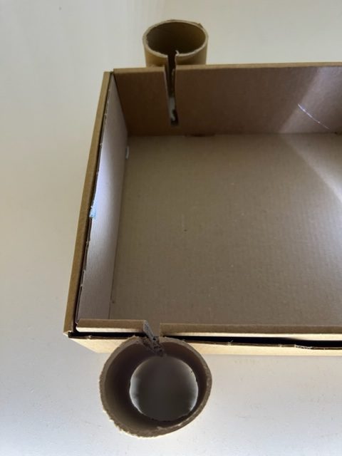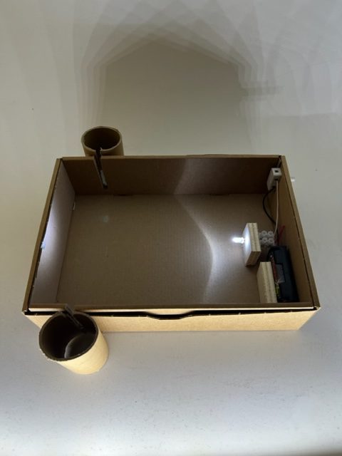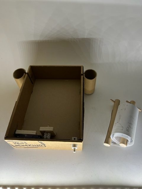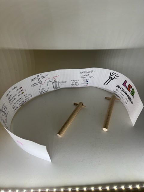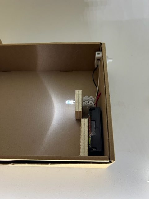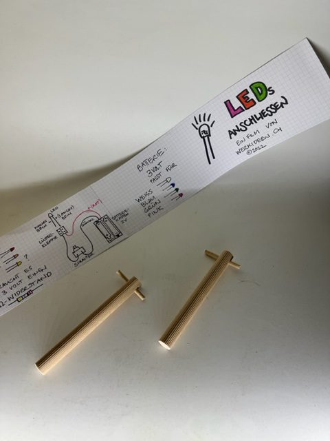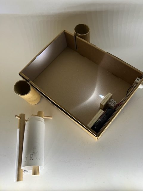 Kartonschachtel, Kartonrohre, grosses Zeichnungspapier, Rundholzstäbe ø ca. 15 mm, LED, Batteriekästchen 3 Volt mit Schalter, Lüsterklemme, Sperrholzleisten