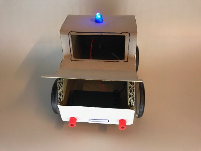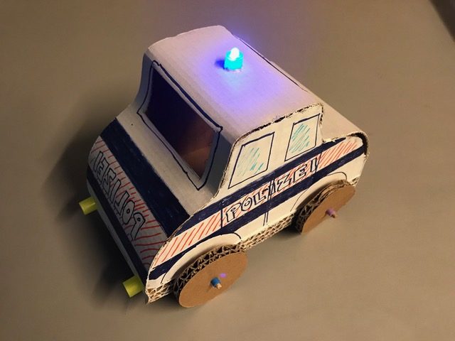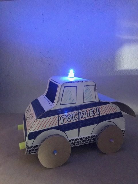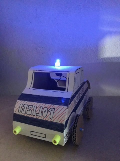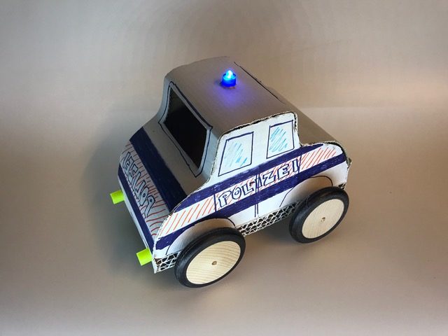 Entwickle ein Polizeiauto aus Wellkarton. Wähle als Achse einen Schweissdraht, der durch die Wellen in der Wellkarton-Bodenplatte geführt wird. Fixiere die Holzräder mit Stoppern und Heissleim. Säge die seitlichen Autoteile zu, füge sie mit Leim und konstruiere das Dach mit einwelligem Wellkarton. Achte darauf, dass du den Batteriekasten nachher in deinem Auto einsetzen kannst.