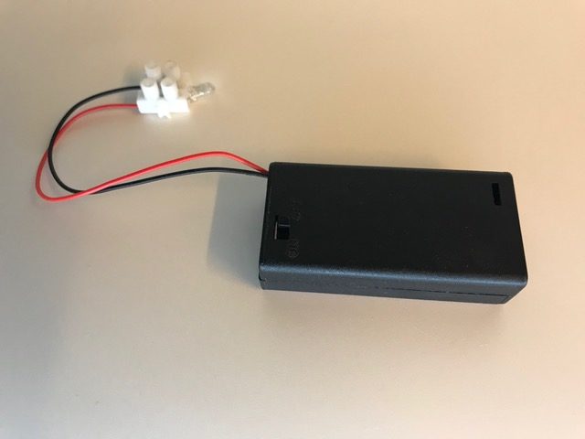 Baue nun bei deinem Auto ein blau blinkendes LED-Lämpchen auf dem Dach ein. Stelle dazu den Stromkreis her mit Batteriekästchen und Lüsterklemme und montiere ihn in deinem Polizeiauto.