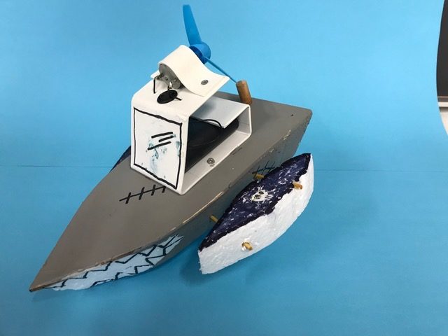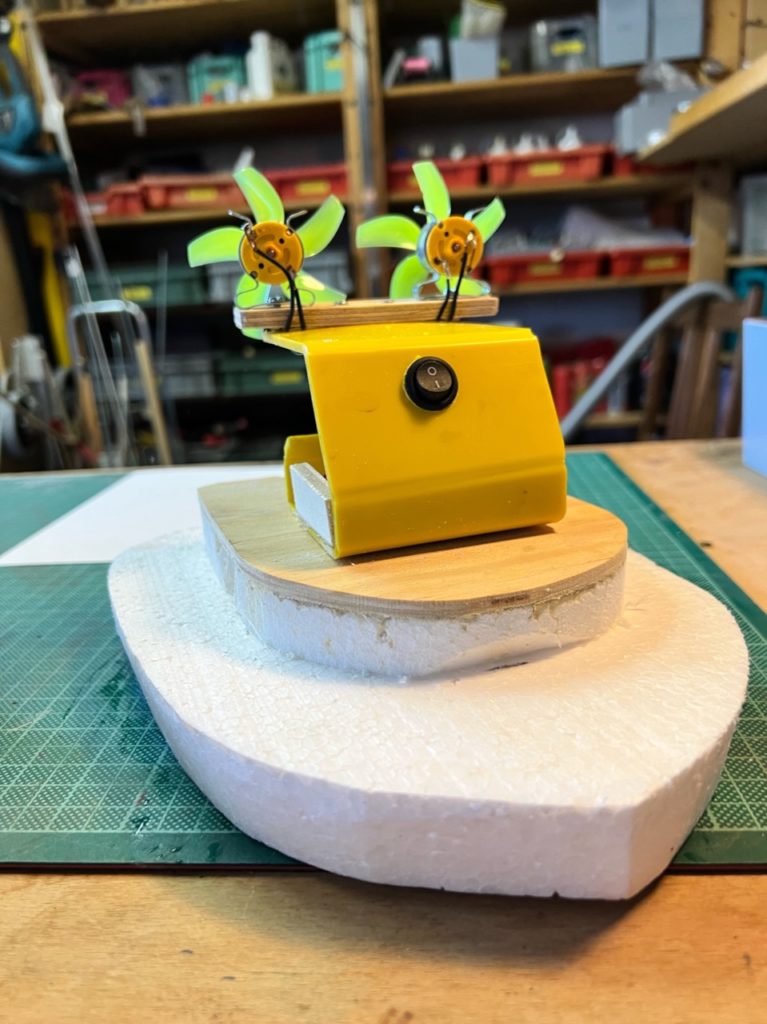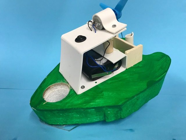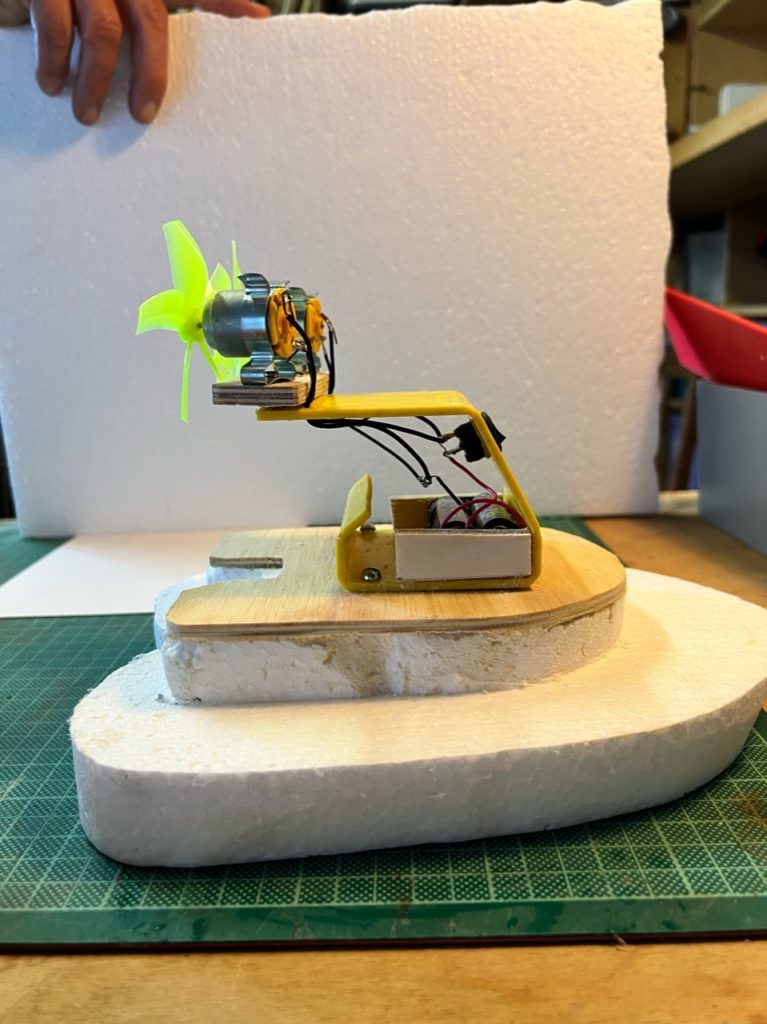 Entwickle ein Luftschraubenboot. Es soll im Schwimmbecken möglichst rasch vorwärts kommen und gut steuerbar sein. Stelle den Rumpf aus Styropor her und klebe darauf eine dünne Holzplatte aus Birkensperrholz. Plane eine Kabine, in der die Batteriehalterung und der Schalter und oben der Motor mit der Luftschraube fixiert werden können. Baue den Stromkreis ein und fixiere den Motor. Wenn du die Motorhalterung mit einer Metallschraube und einer Stoppmutter fixierst, kannst du den Motor als Ruder nutzen und jeweils je nach Kurve leicht nach links oder rechts drehen. Du kannst aber auch ein Ruder einbauen. Teste dein Boot im Wasser und fixiere die Kabine mit Schrauben auf dem Holzbrett. Gestalte dein Luftschraubenboot mit Material aus dem Werkstofflager, lasse dich dabei durch Bilder von Motorbooten und Yachten inspirieren. Wassere dein Luftschraubenboot.