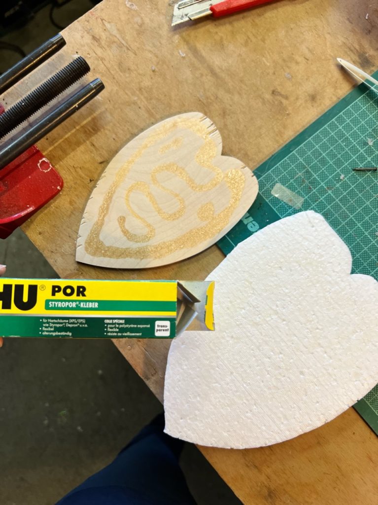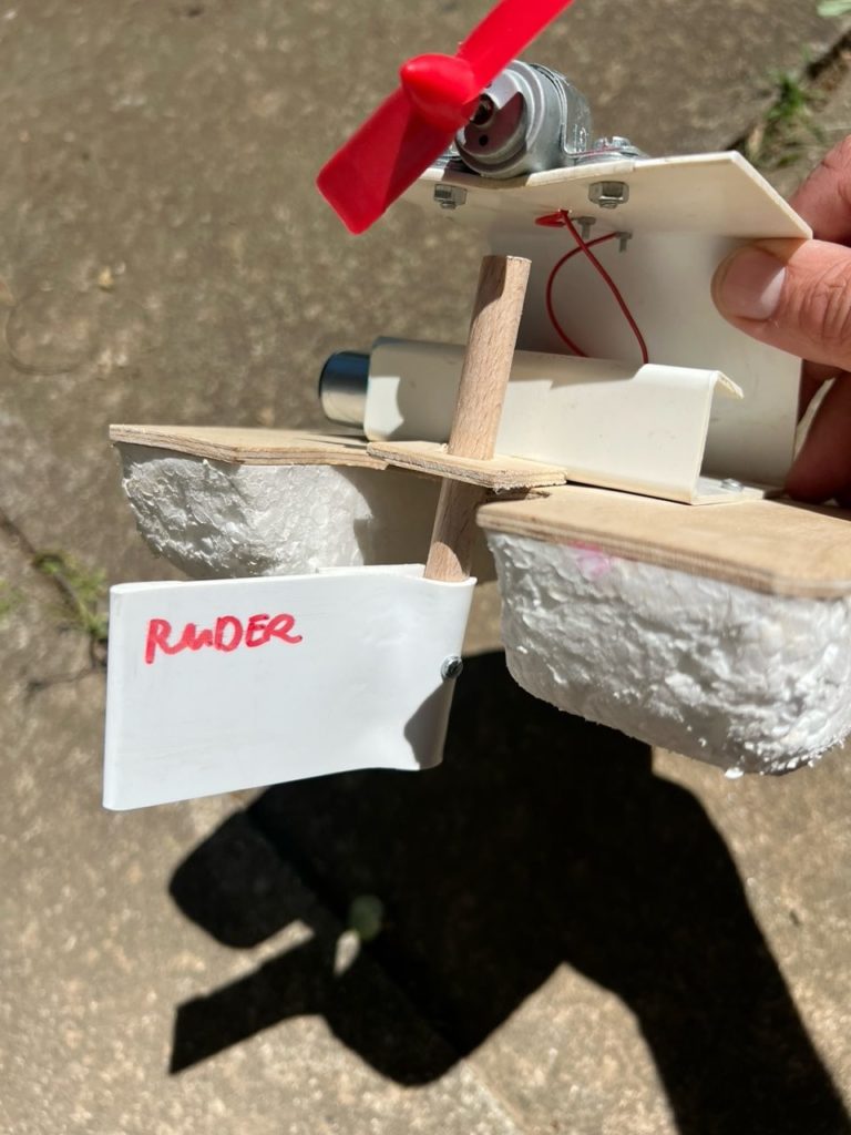 Styropor, Birkensperrholz 4 mm, Elektromotor, Motorhalterung und Luftschraube, Batteriehalterung, Batterien, div. Elektromaterial, div. Gestaltungsmaterial aus dem Werkstofflager