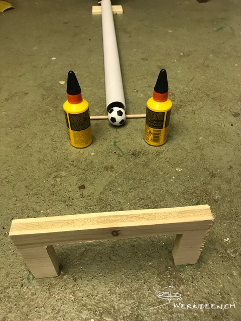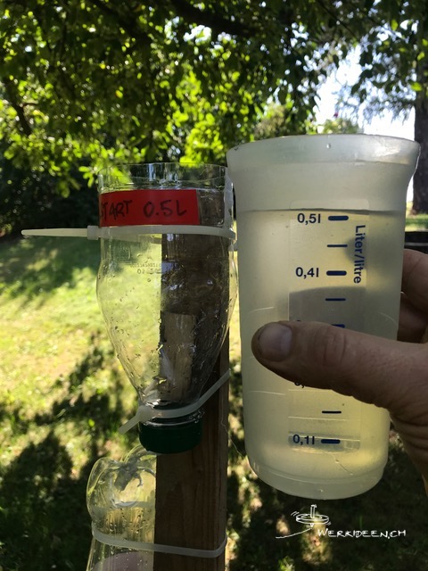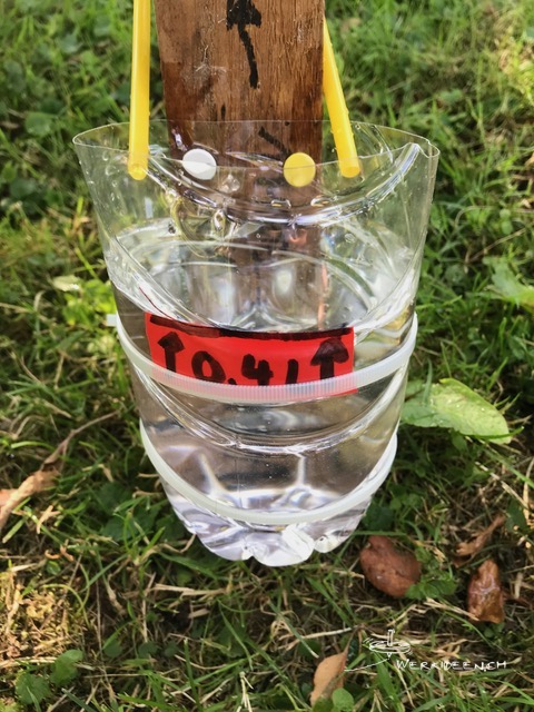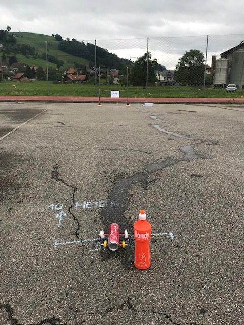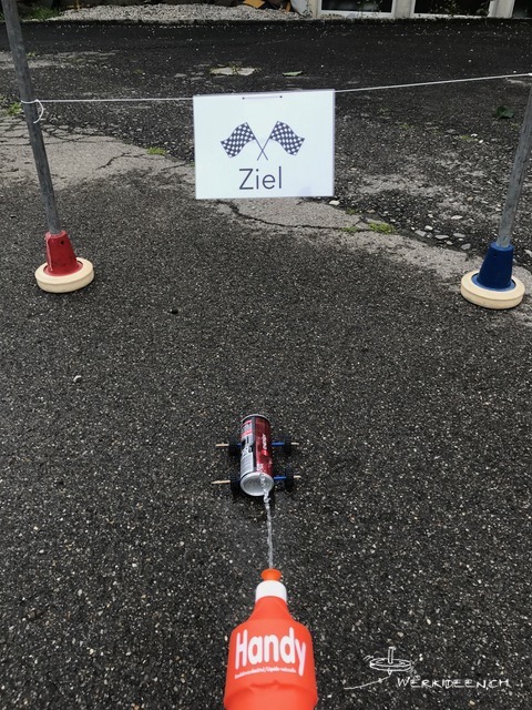 Wir starten einen kleinen Tüftelwettbewerb: Das Wasser soll möglichst lange unterwegs sein, bis es unten ankommt. Wenn du mitmachen willst, musst du folgende Regeln einhalten: Die Länge des Bretts/der Dachlatte ab Boden bis oben ist 1 Meter 50 cm. Fülle oben 5 dl Wasser ein und stoppe die Zeit, wenn unten 4 dl im untersten Gefäss angekommen sind. Schicke ein Video und die gemessene Zeit an info@werkideen.ch. Wir führen eine Rangliste auf werkideen.ch.