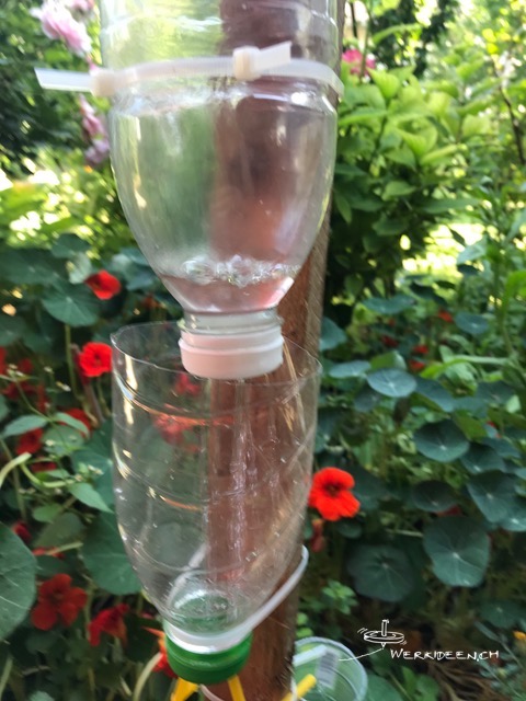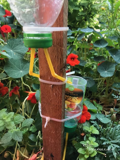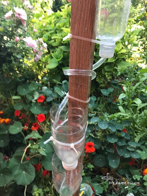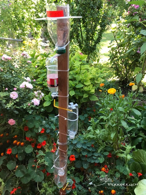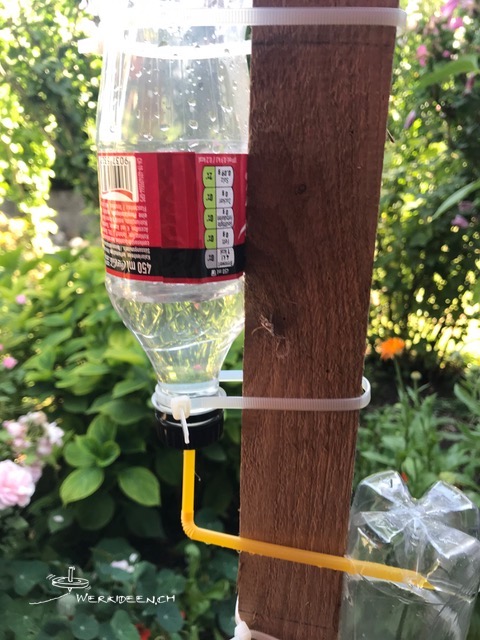Entwickle mit PET-Flaschen oder anderen Gefässen und mit Röhrchen und Schläuchen eine möglichst lange Wasserleitung. Fixiere die einzelnen Gefässe und Teile mit Kabelbindern oder anderen Hilfsmitteln an einem Brett oder einer Dachlatte. Bohre Löcher und montiere Röhrchen und Schlauchstücke, so dass das meiste Wasser von oben nach unten läuft und dabei so lange wie möglich unterwegs ist. Das Brett oder die Dachlatte kannst du in den Boden stecken oder an einer Wand fixieren.