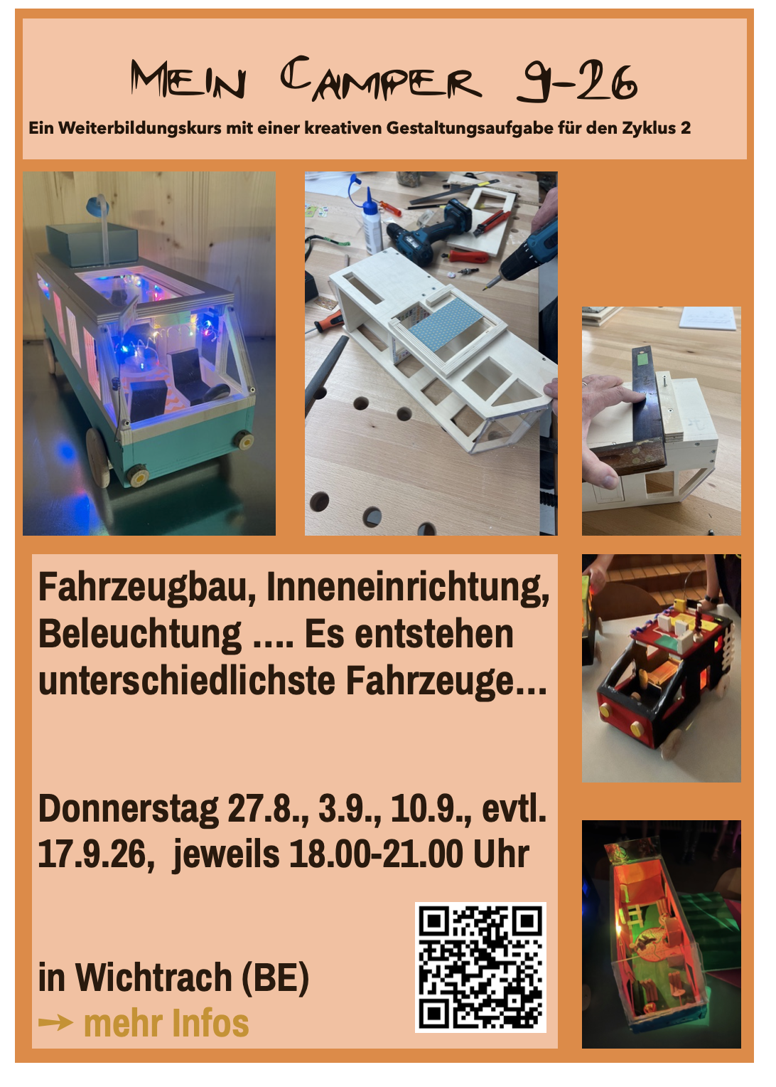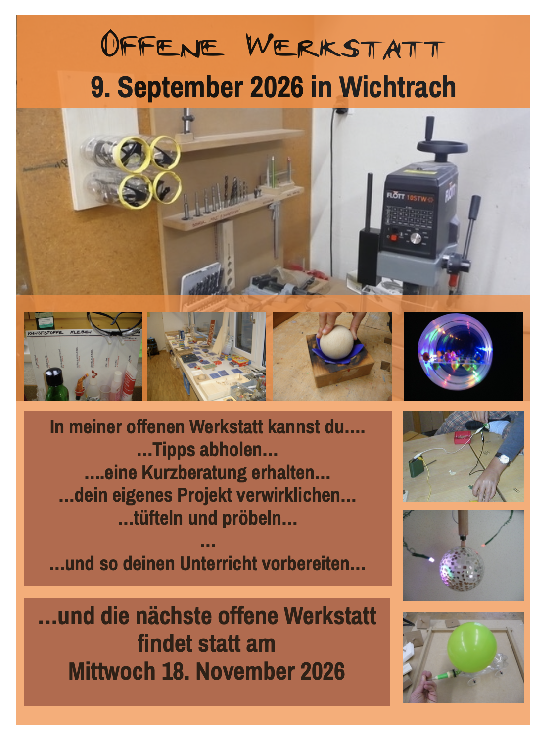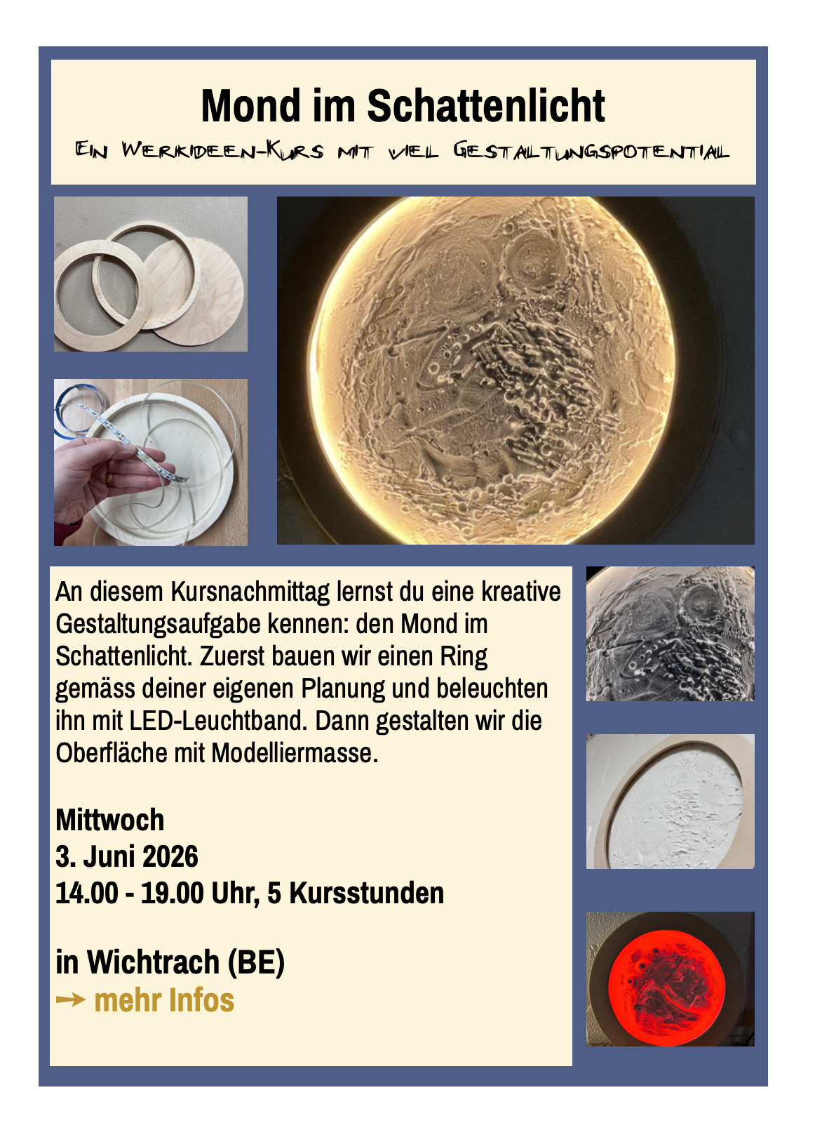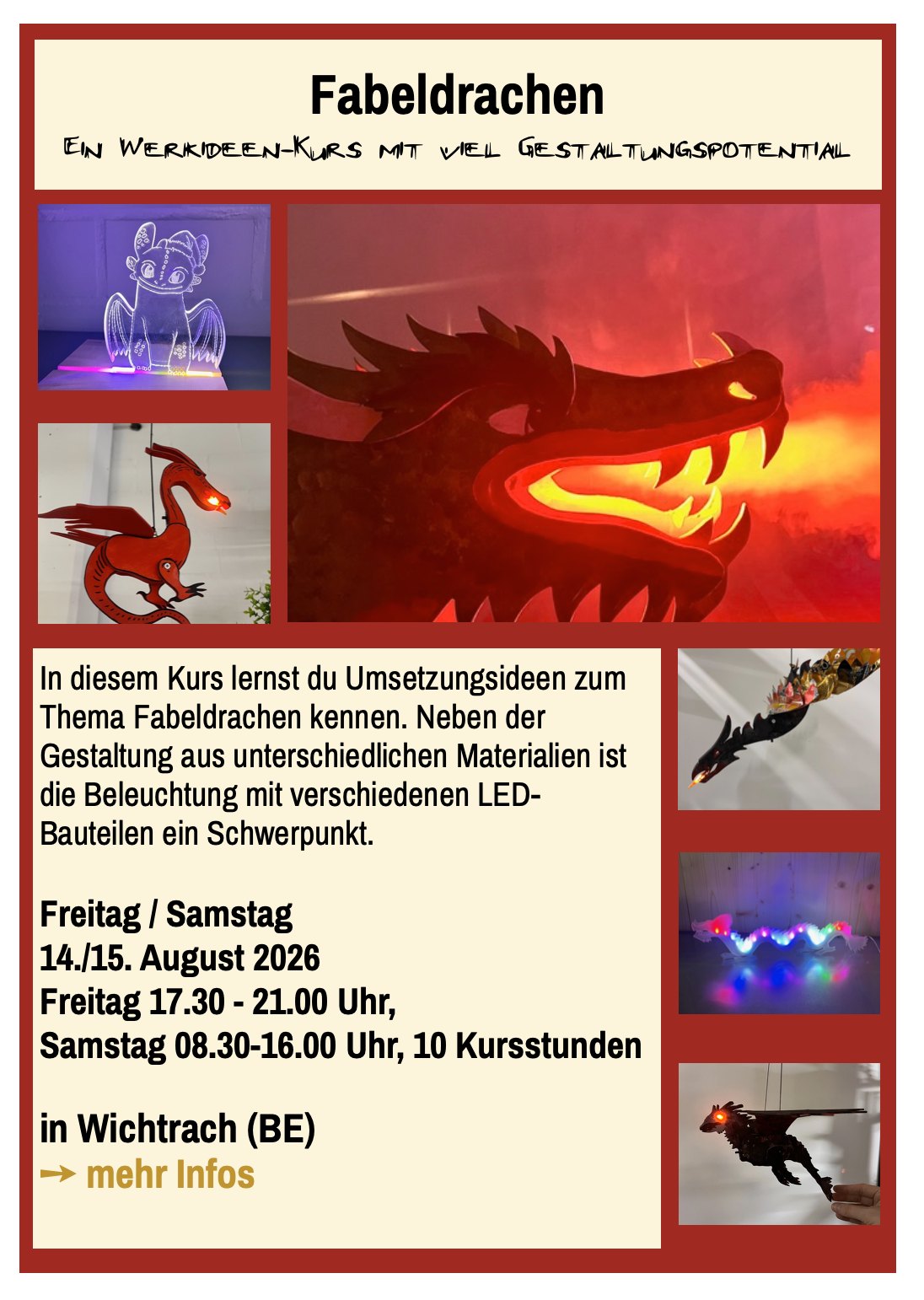 Ich schreibe über meine eigene Website werkideen.ch Kurse aus in Wichtrach /BE. Dort habe ich meine Infrastruktur aufgebaut und den Werkraum so eingerichtet, dass auch Kurse mit bis zu 12 Teilnehmenden durchgeführt werden können. Lehrpersonen im Kanton Bern können sich das Kursgeld von der ERZ zurück erstatten lassen.